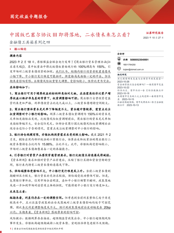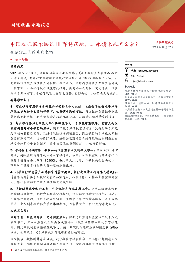 【西部证券】【20231027】金融债工具箱系列之四:中国版巴塞尔协议III即将落地,二永债未来怎么看?-21页