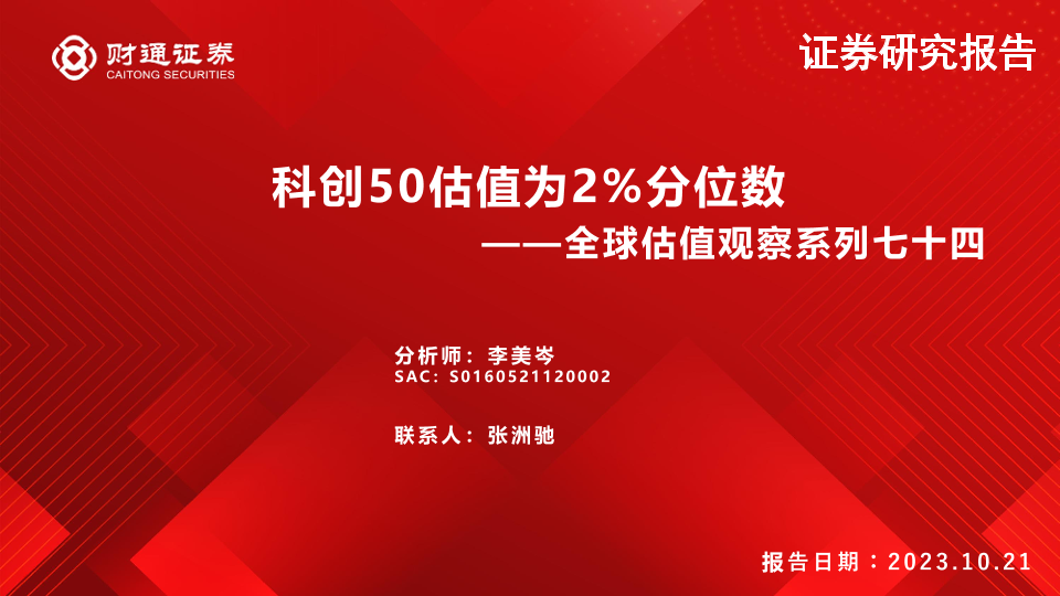 【财通证券】【20231021】全球估值观察系列七十四:科创50估值为2%分位数-29页
