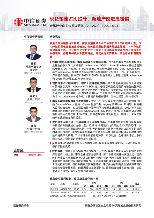 【中信证券】【20220824】金属行业南美锂盐湖跟踪(2022Q2):现货销售占比提升,新建产能进展缓慢-26页