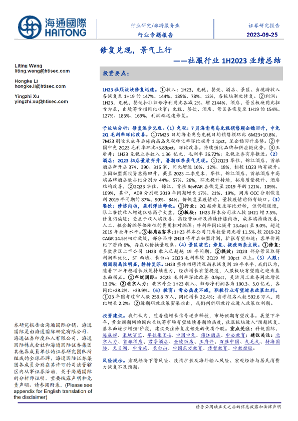【海通国际】【20230925】社服行业1H2023业绩总结:修复兑现,景气上行-31页