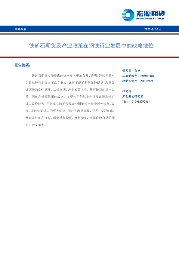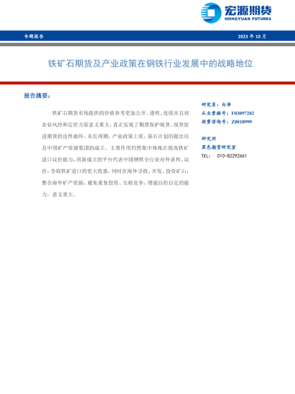 【宏源期货】【202310】铁矿石期货及产业政策在钢铁行业发展中的战略地位-18页