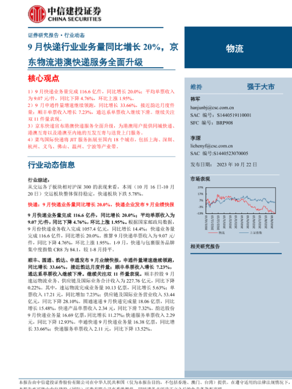 【中信建投证券】【20231022】物流行业:9月快递行业业务量同比增长20%,京东物流港澳快递服务全面升级-24页
