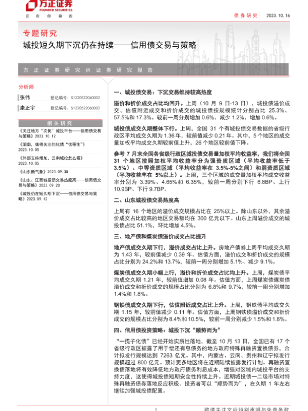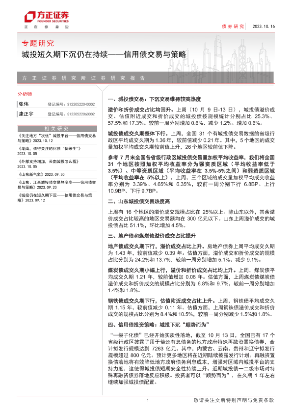 【方正证券】【20231016】信用债交易与策略:城投短久期下沉仍在持续-15页