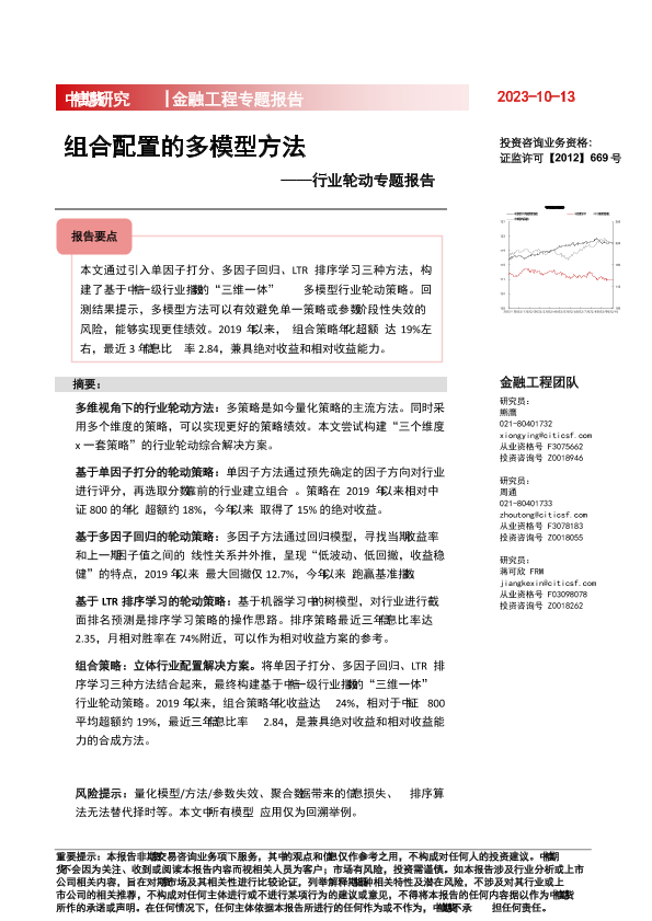 多模型方法 投资咨询 行业轮动 量化策略 金融工程