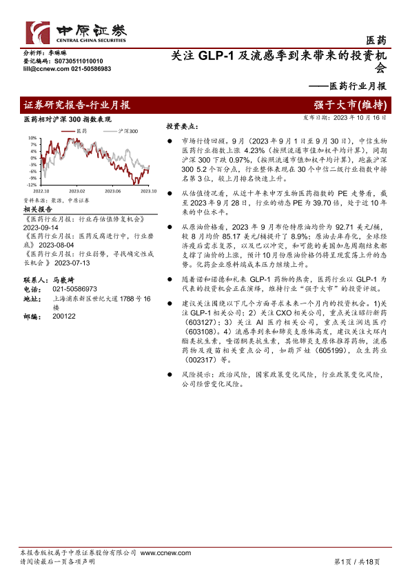 【中原证券】【20231016】医药行业月报:关注GLP_1及流感季到来带来的投资机会-18页