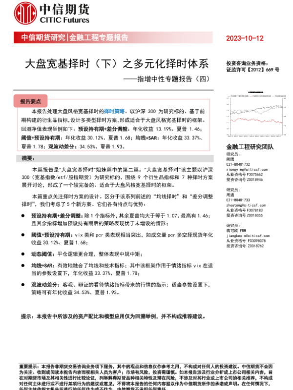 中信期货 多元化择时体系 大盘宽基择时 沪深300 金融工程