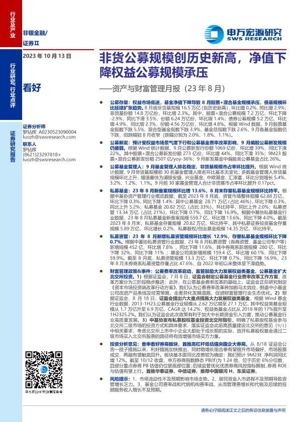 【申万宏源】【20231013】证券行业资产与财富管理月报(23年8月):非货公募规模创历史新高,净值下降权益公募规模承压-19页
