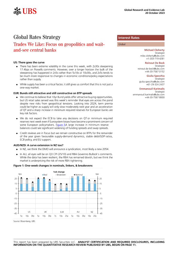【UBS Securities LLC】【20231020】Global Rates Strategy _Trades We Like Focus on geopolitics and wait-and-see central banks-14页