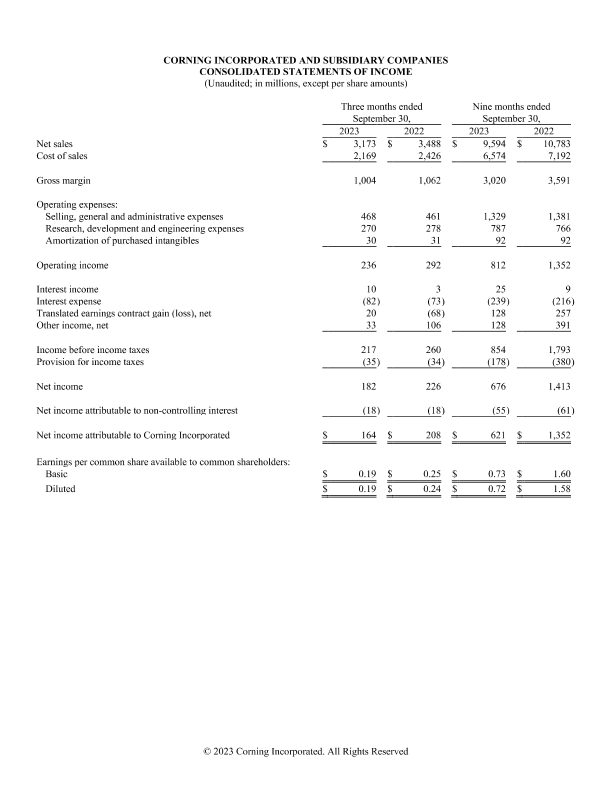 季度报告 2023年 收入声明 财务报表 康宁公司