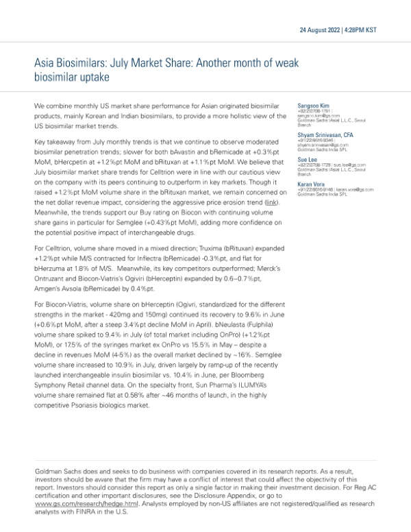 【Goldman Sachs】【20220824】Asia Biosimilars July Market Share Another month of weak biosimilar uptake-11页