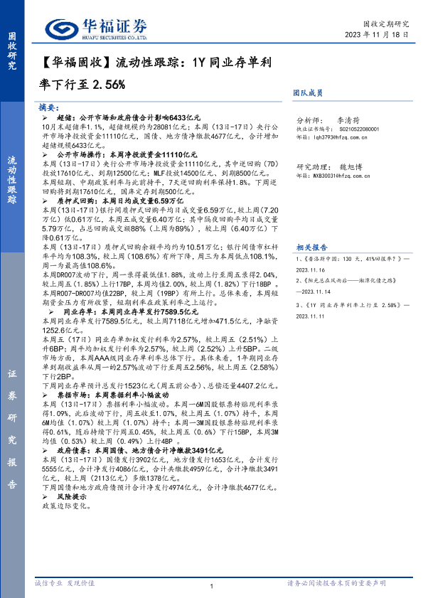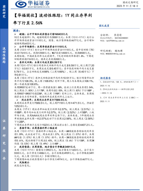 【华福证券】【20231118】【华福固收】流动性跟踪:1Y同业存单利率下行至2.56%-12页