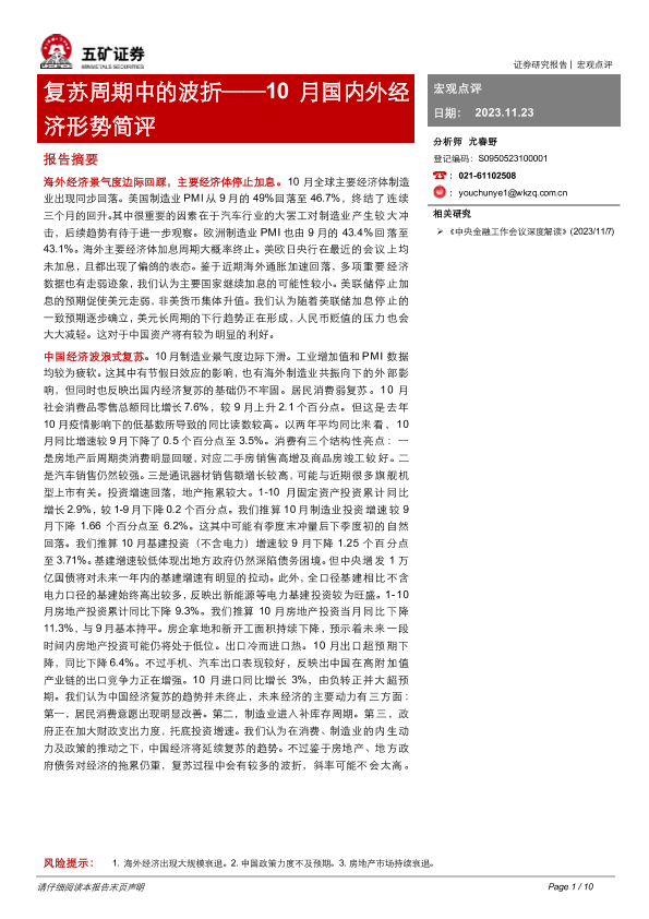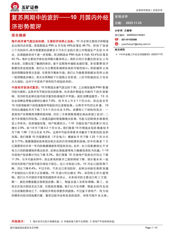【五矿证券】【20231123】10月国内外经济形势简评:复苏周期中的波折-10页