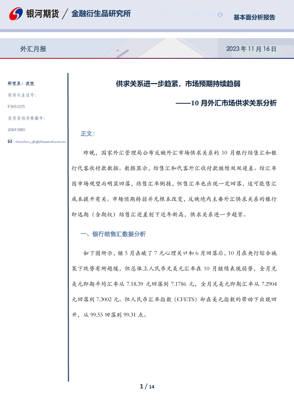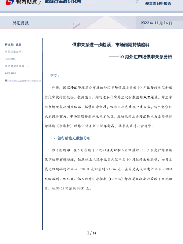 【银河期货】【20231116】10月外汇市场供求关系分析:供求关系进一步趋紧,市场预期持续趋弱-14页