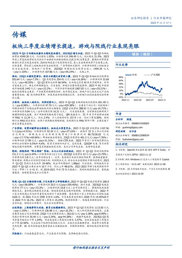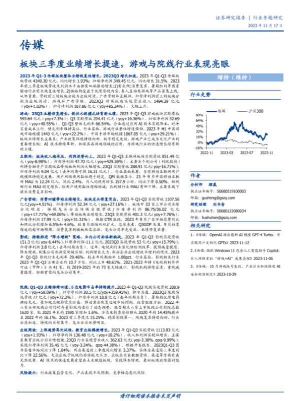 【国盛证券】【20231117】传媒行业专题研究:板块三季度业绩增长提速,游戏与院线行业表现亮眼-23页