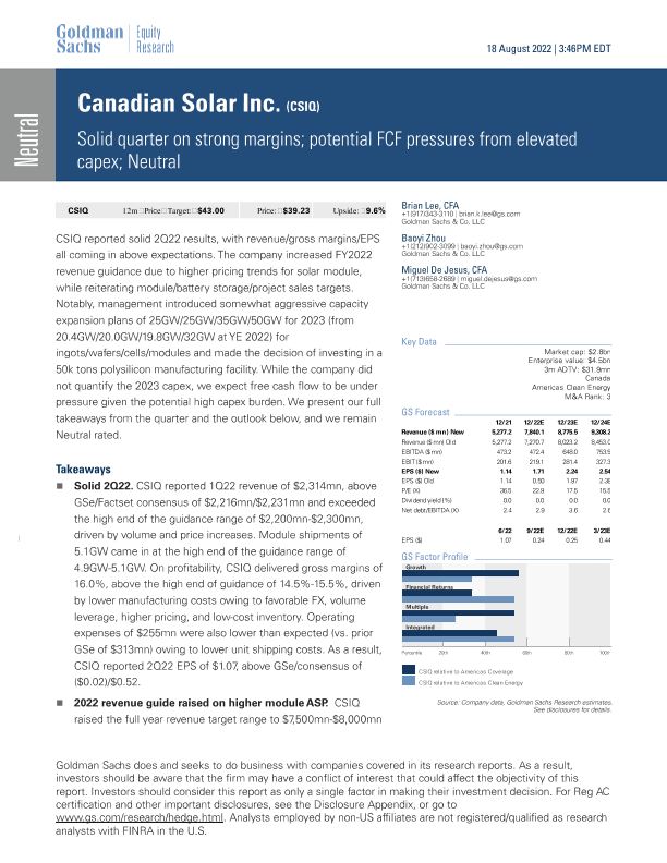 【Goldman Sachs】【20220818】Canadian Solar Inc. (CSIQ) 固定收益分析与展望-9页