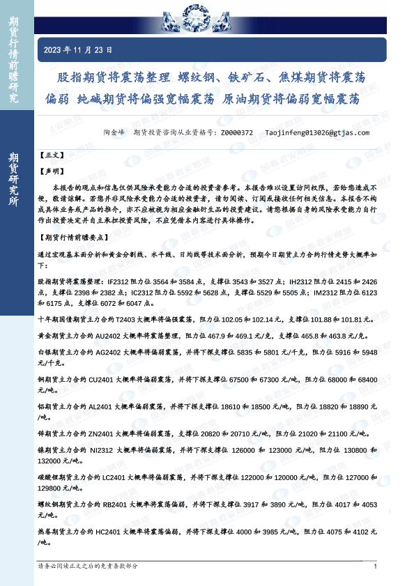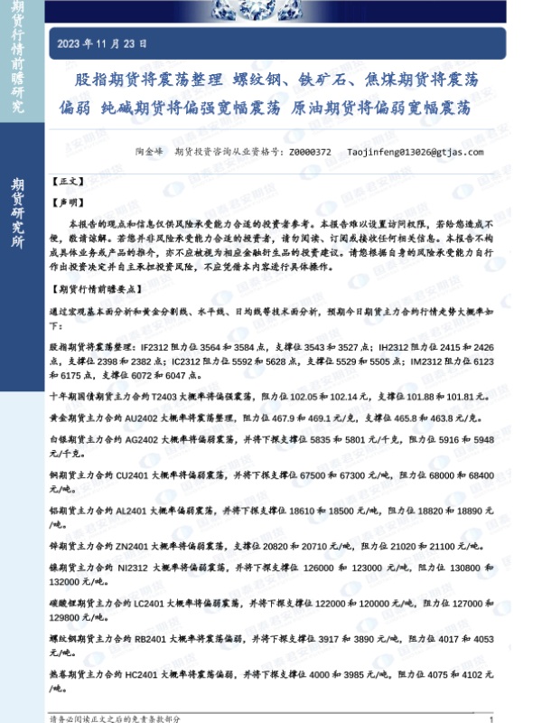 【国泰君安期货】【20231123】股指期货将震荡整理 螺纹钢、铁矿石、焦煤期货将震荡偏弱 纯碱期货将偏强宽幅震荡 原油期货将偏弱宽幅震荡-38页