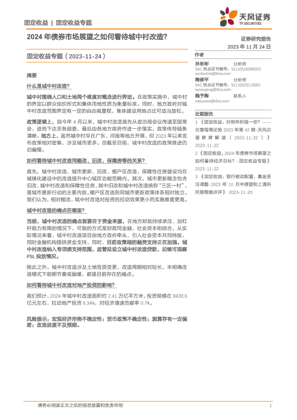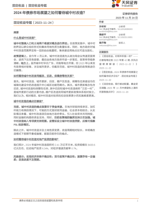 【天风证券】【20231124】2024年债券市场展望之如何看待城中村改造?-12页