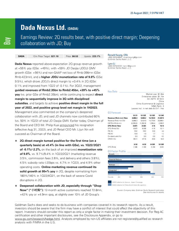 【Goldman Sachs】【20220823】ults beat, with positive direct margin; Deepening collaboration with JD; Buy-13页