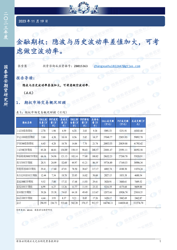 【国泰君安期货】【20231119】金融期权:隐波与历史波动率差值加大,可考虑做空波动率。-16页