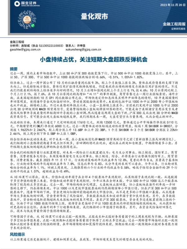 【国金证券】【20231120】量化观市:小盘持续占优,关注短期大盘超跌反弹机会-15页