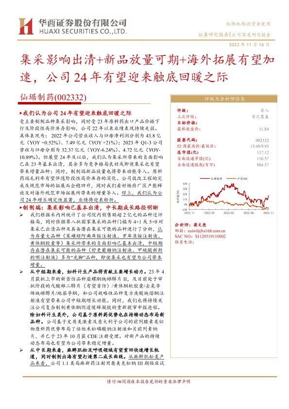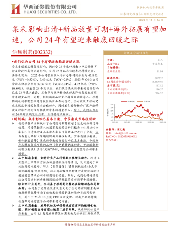 【华西证券】【20231116】仙琚制药-002332.SZ-集采影响出清+新品放量可期+海外拓展有望加速,公司24年有望迎来触底回暖之际-42页