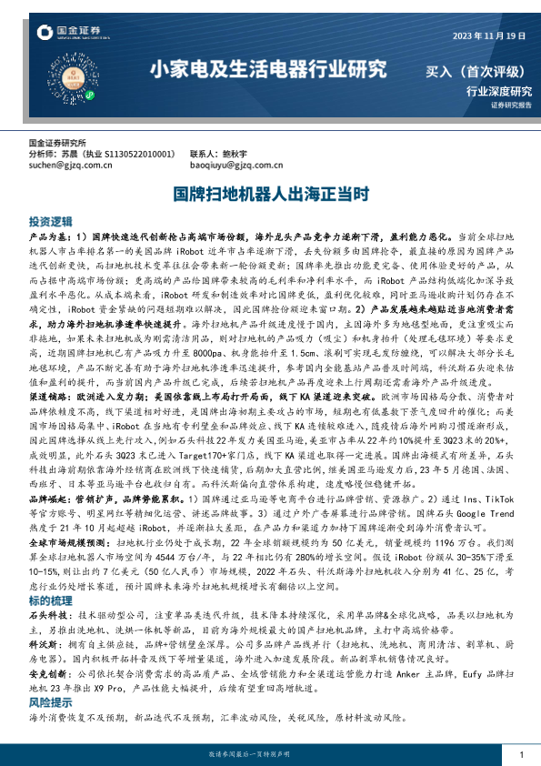【国金证券】【20231119】小家电及生活电器行业研究:国牌扫地机器人出海正当时-25页