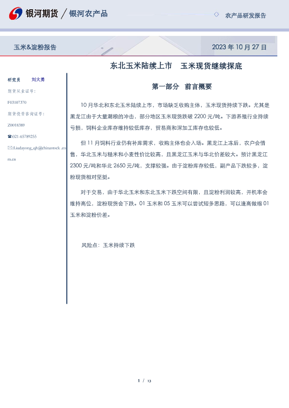 【银河期货】【20231027】玉米&淀粉报告:东北玉米陆续上市 玉米现货继续探底-13页