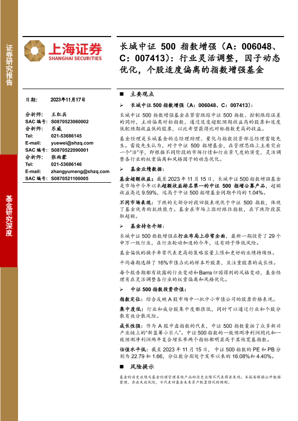 【上海证券】【20231117】长城中证500指数增强(A:006048、C:007413):行业灵活调整,因子动态优化,个股适度偏离的指数增强基金-20页