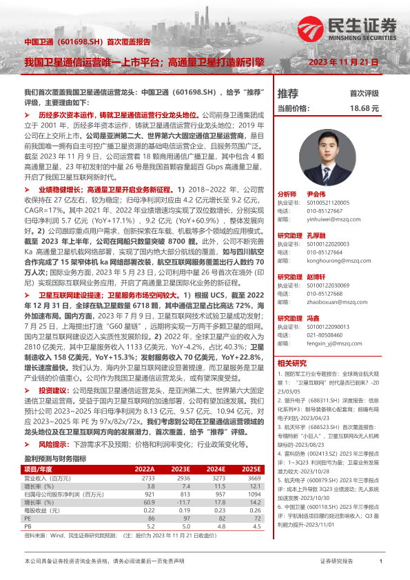 【民生证券】【20231121】中国卫通-601698.SH-我国卫星通信运营唯一上市平台;高通量卫星打造新引擎-18页