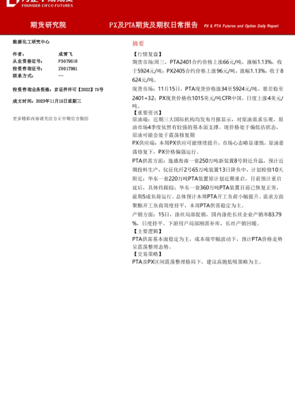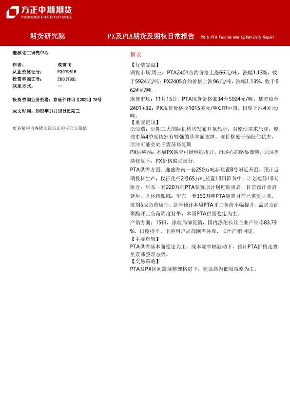 【方正中期期货】【20231115】PX及PTA期货及期权日常报告-14页