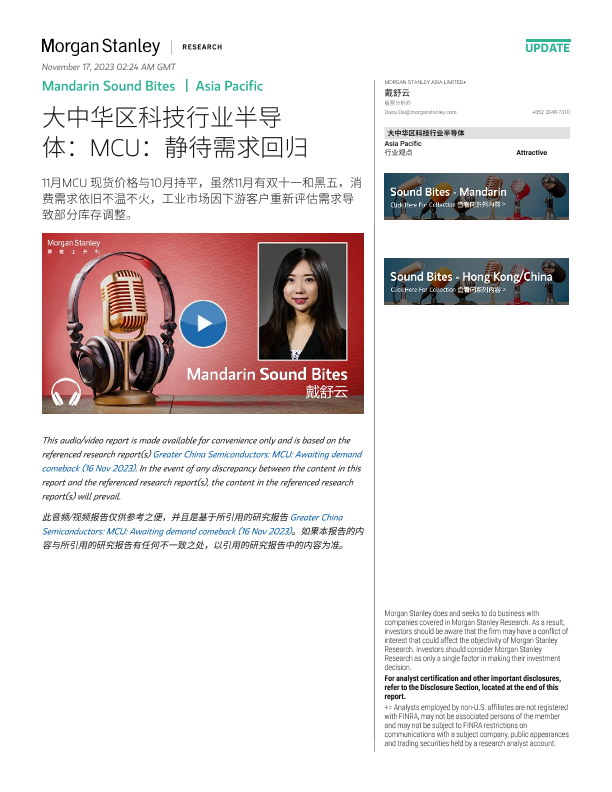 【Morgan Stanley】【20231116】大中华区科技行业半导体:MCU:静待需求回归-10页