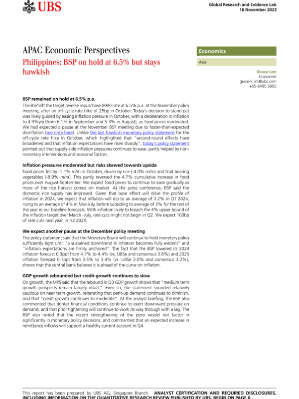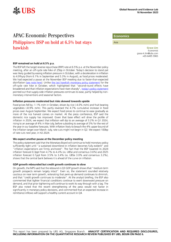 【UBS AG】【20231116】APAC Economic Perspectives Philippines BSP on hold at 6.5% but stays hawkish-9页