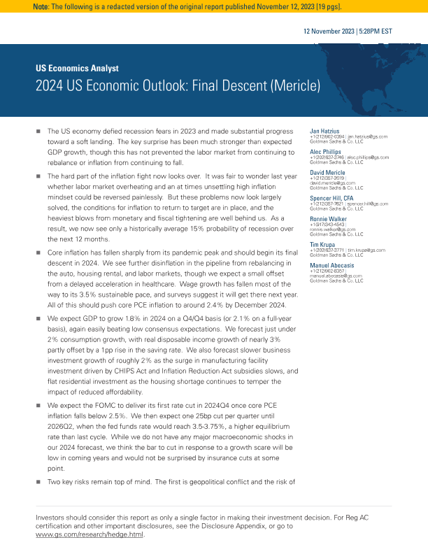 【Goldman Sachs】【202311】2024年美国经济展望-18页