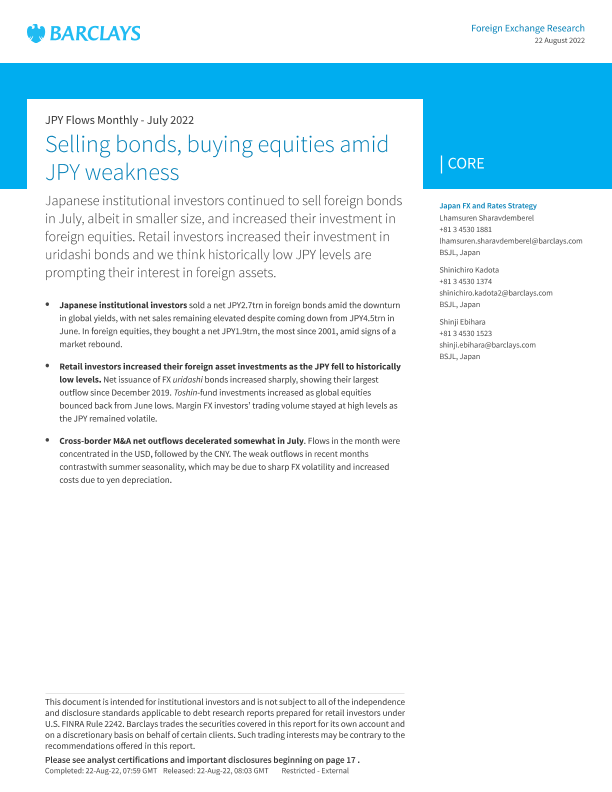 【Barclays】【20220822】Y Flows Monthly - July 2022 Selling bonds, buying equities amid JPY weakness-20页