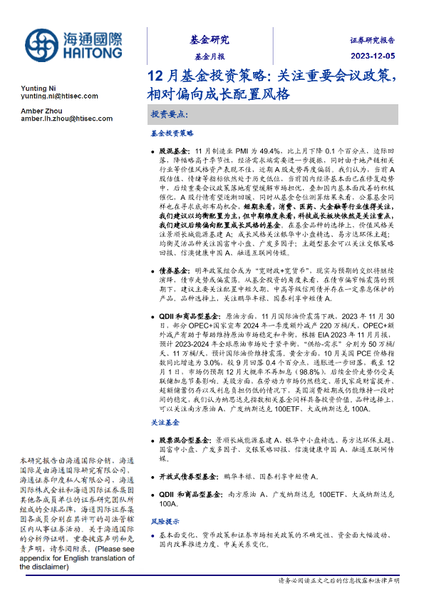 【海通国际】【20231205】12月基金投资策略:关注重要会议政策,相对偏向成长配置风格-20页