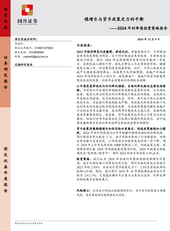 【国开证券】【20231204】稳增长与货币政策定力的平衡——2024年利率债投资策略报告-21页