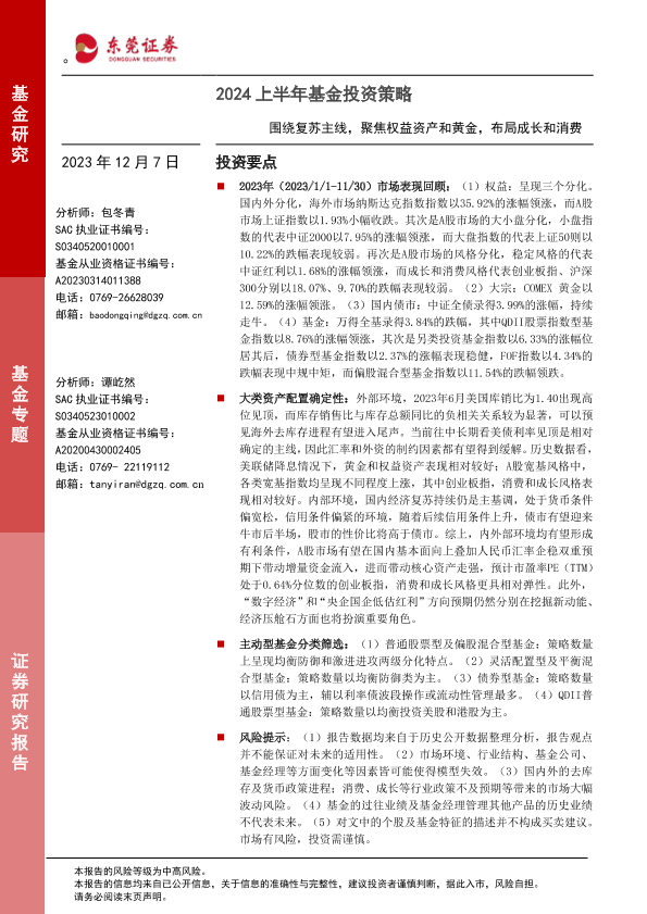 【东莞证券】【20231207】2024上半年基金投资策略:围绕复苏主线,聚焦权益资产和黄金,布局成长和消费-21页