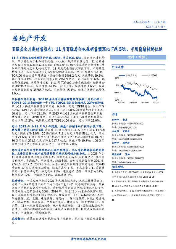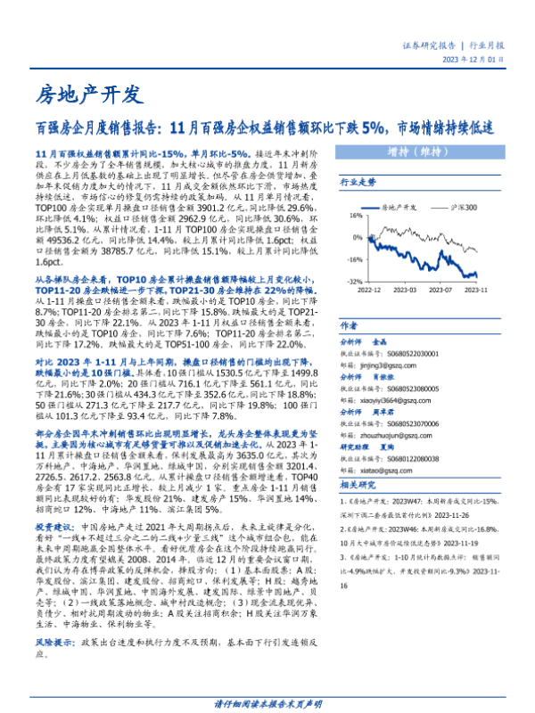 【国盛证券】【20231201】百强房企月度销售报告:11月百强房企权益销售额环比下跌5%,市场情绪持续低迷-10页