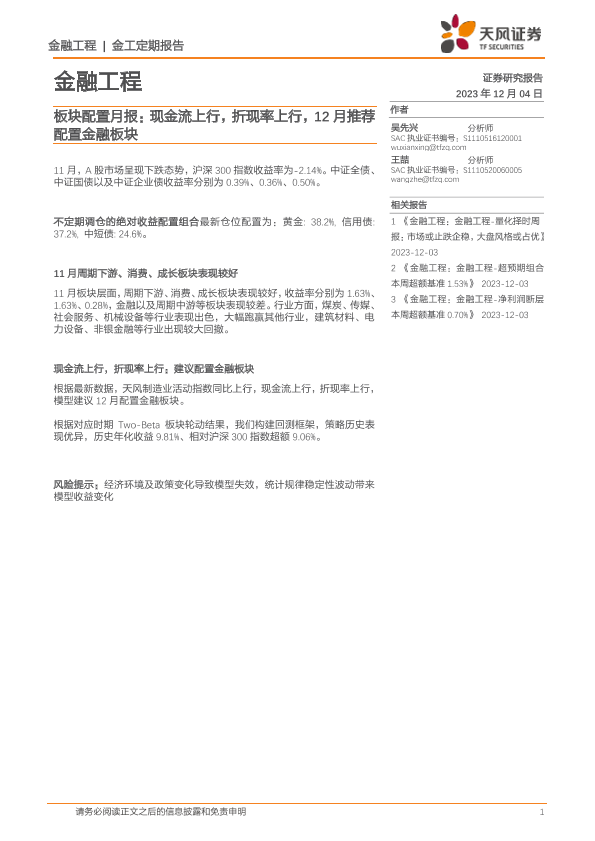 【天风证券】【20231204】板块配置月报:现金流上行,折现率上行,12月推荐配置金融板块-10页