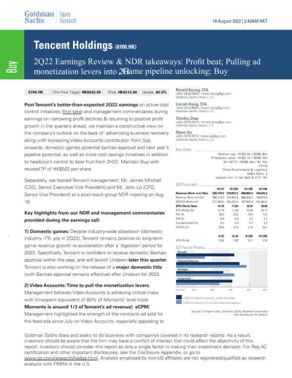 【Goldman Sachs】【20220819】2Q22收益回顾和NDR要点:利润超出预期;下半年拉动广告变现杠杆,游戏管线解锁;买入-23页