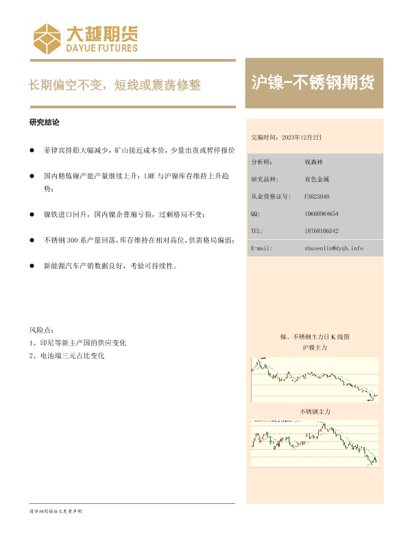 【大越期货】【20231202】沪镍-不锈钢期货月度报告:长期偏空不变,短线或震荡修整-15页