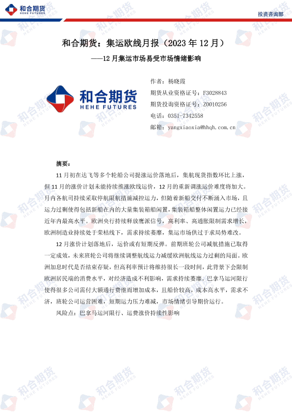 【和合期货】【20231201】集运欧线月报(2023年12月):12月集运市场易受市场情绪影响-11页