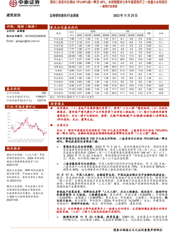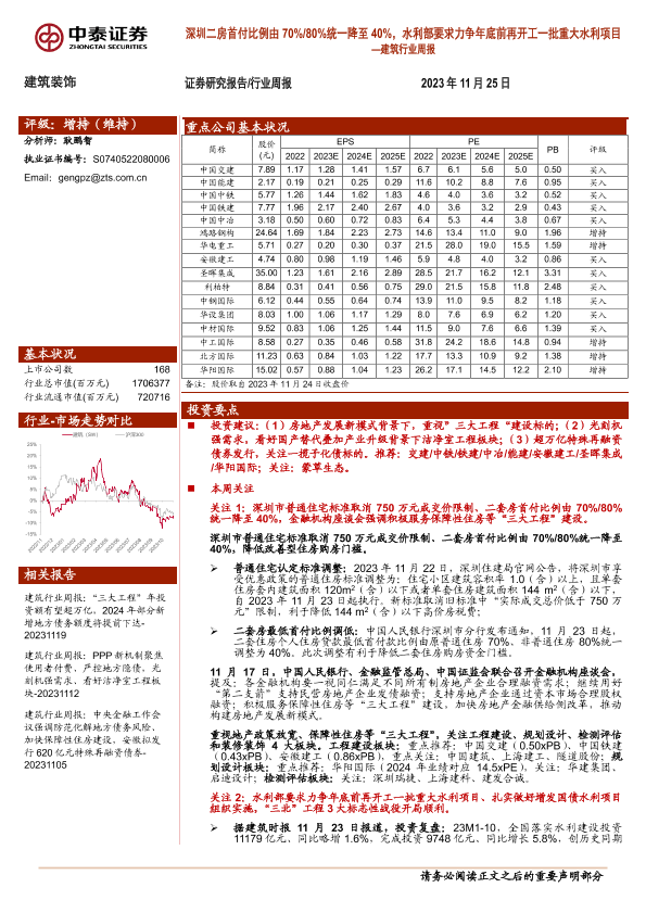 【建筑装饰】【20231125】建筑行业周报:深圳二房首付比例由70%_80%统一降至40%,水利部要求力争年底前再开工一批重大水利项目-16页
