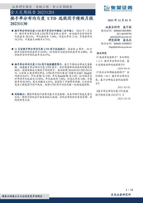 【东吴证券】【20231201】金工定期报告:换手率分布均匀度UTD选股因子绩效月报-13页