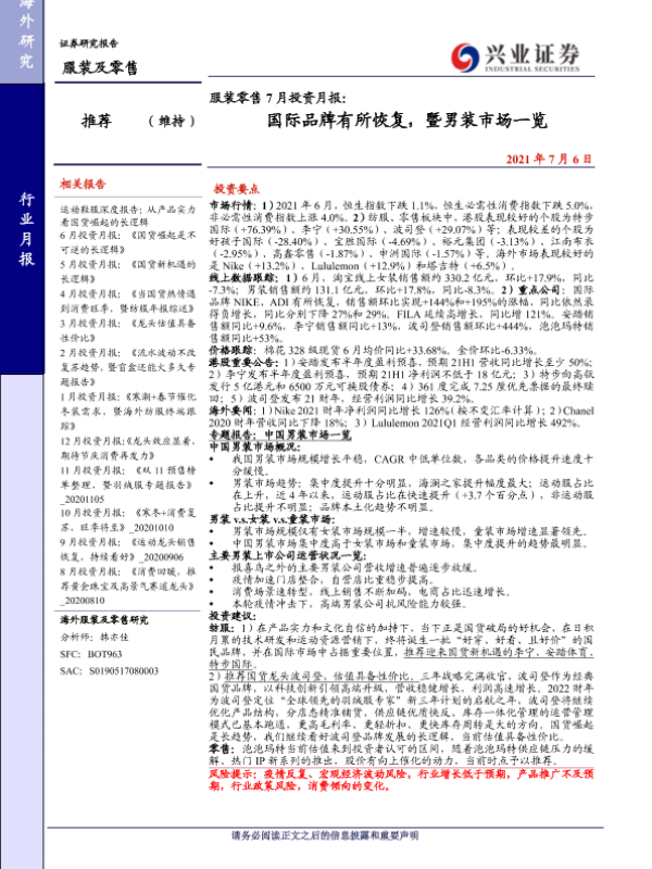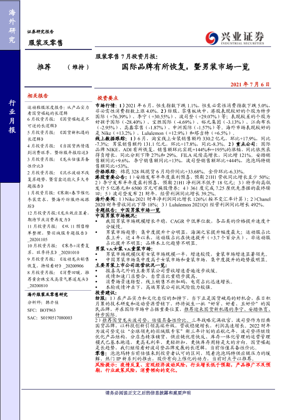 【兴业证券】【20210706】服装零售行业7月投资月报:国际品牌有所恢复,暨男装市场一览-25页