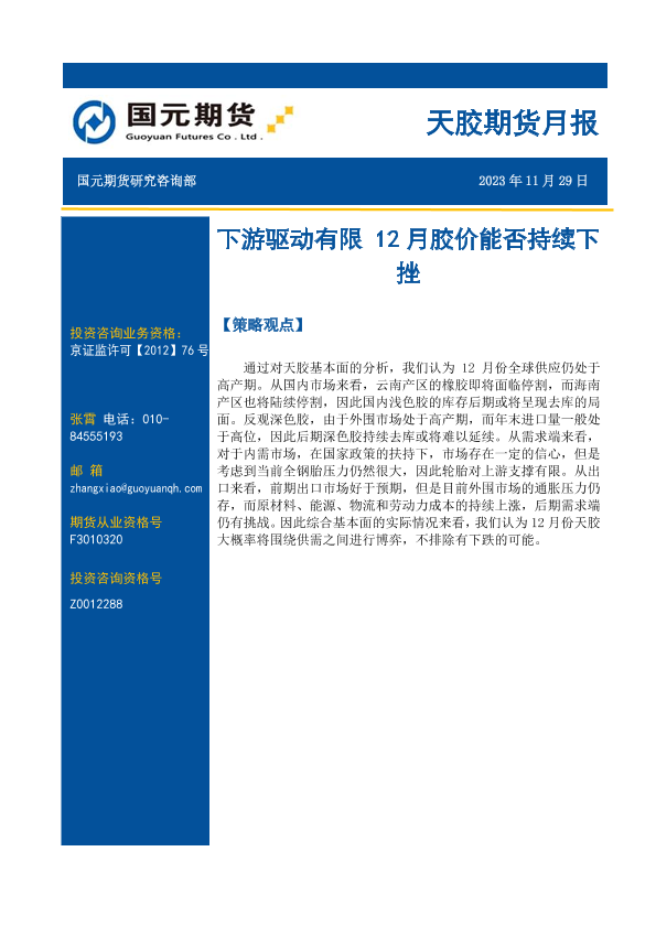 【国元期货】【20231129】天胶期货月报:下游驱动有限 12月胶价能否持续下挫-11页