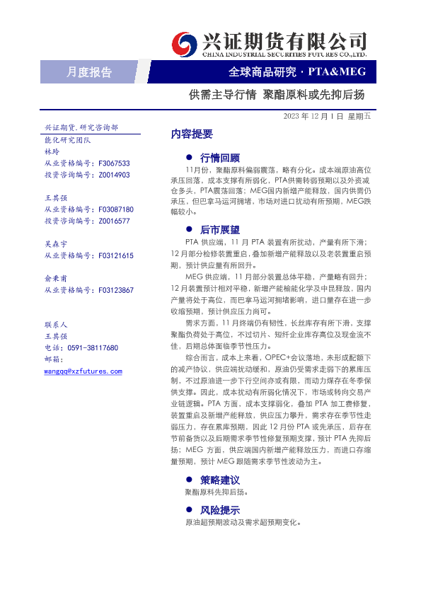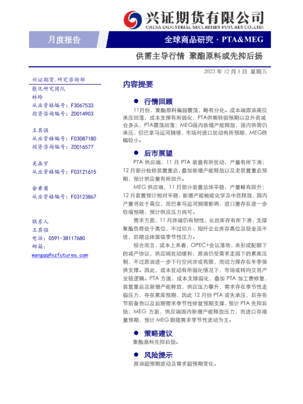 【兴证期货】【20231201】PTA&MEG月度报告:供需主导行情 聚酯原料或先抑后扬-11页