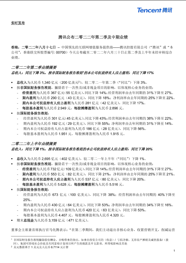 【腾讯控股有限公司】【20220817】2022年第二季及中期腾讯业绩财报摘要-10页