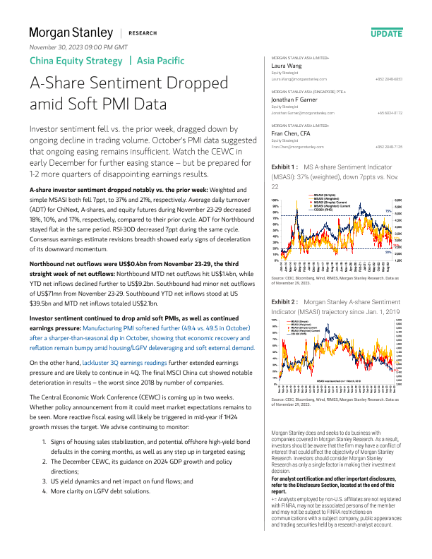 【Morgan Stanley】【2023】China Equity Strategy A-Share Sentiment Dropped amid Soft PMI Data-10页