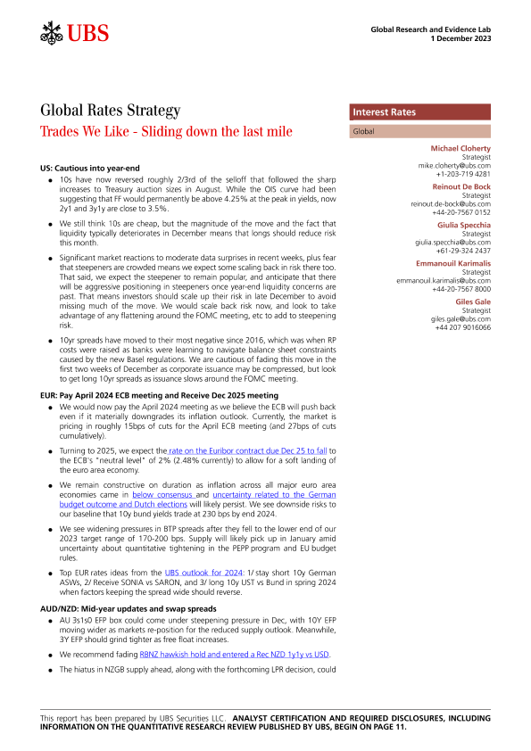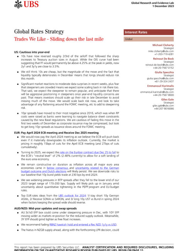 【UBS Securities LLC】【20231201】me-Global Rates Strategy _Trades We Like - Sliding down the last mile-15页